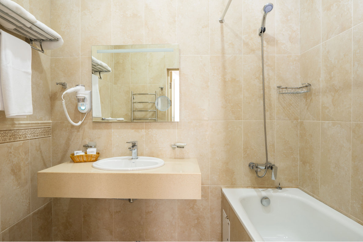 Площадь номера - 16-17 кв.м. 1 осн. место. Балкон. Мебель: вешалка, зеркало, кровать полутороспальная, прикроватная тумбочка, стол, стул, шкаф. Оборудование: мини-холодильник, сейф, сплит-система, телевизор, телефон, чайная станция. Санузел: с ванной, тапочки, туалетные принадлежности, фен, халат. Сервис: Wi-Fi бесплатно, room-сервис, смена полотенец, смена постельного белья, уборка номера, услуги телефонной связи по территории отеля.